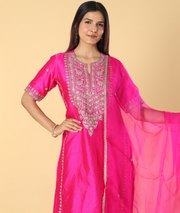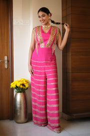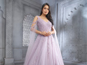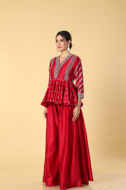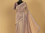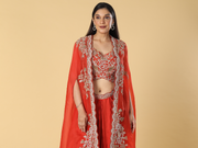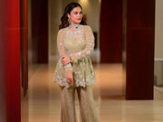 Beige net heavily embroidered indowestern paired with pleated satin organza skirt