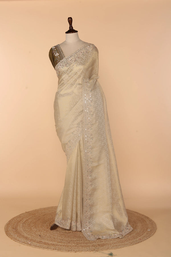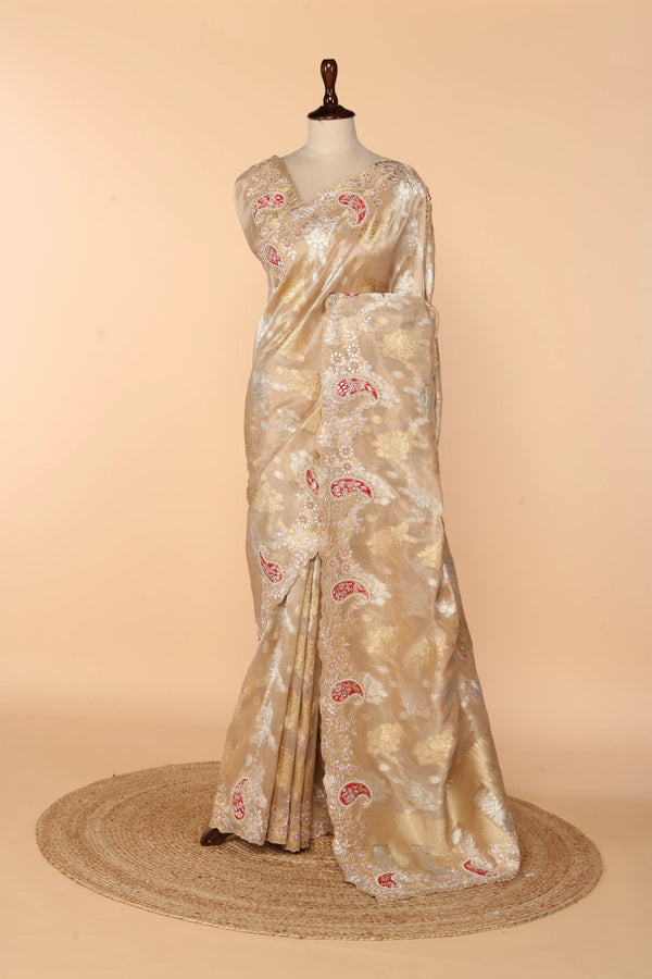 Beige Banarasi Saree with Sequence, Multicolour Beads & Mirror Work