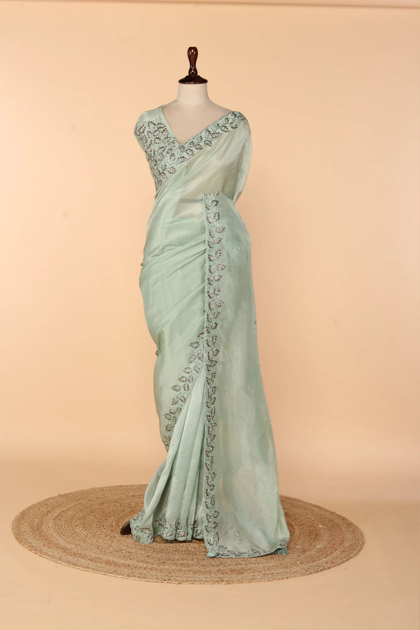Sea Green Tissue Saree with Oxidised Tube, Self-Coloured Beads & Sequin Work