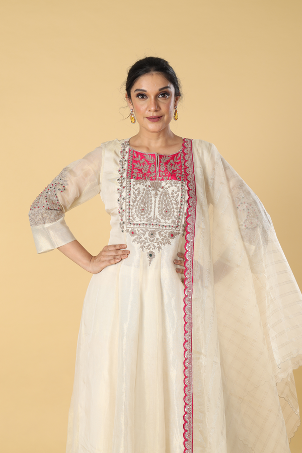 Off white pure chanderi sik dori embroidered dress paired with dola silk pants and organza dupatta