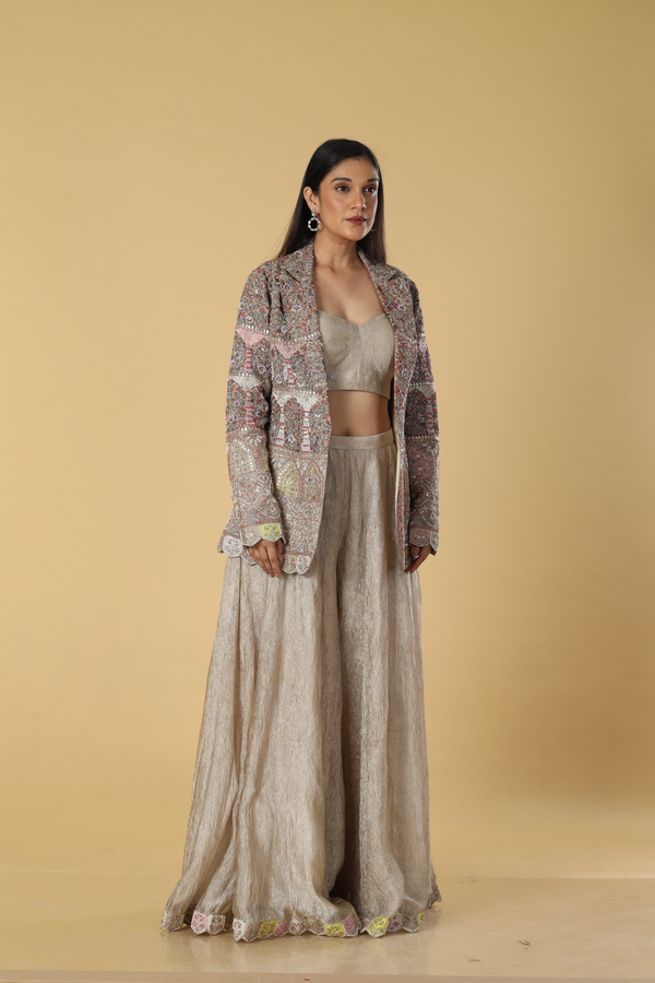 Champange gold crushed tissue palazzo tube paired with zardosi & resham jacket