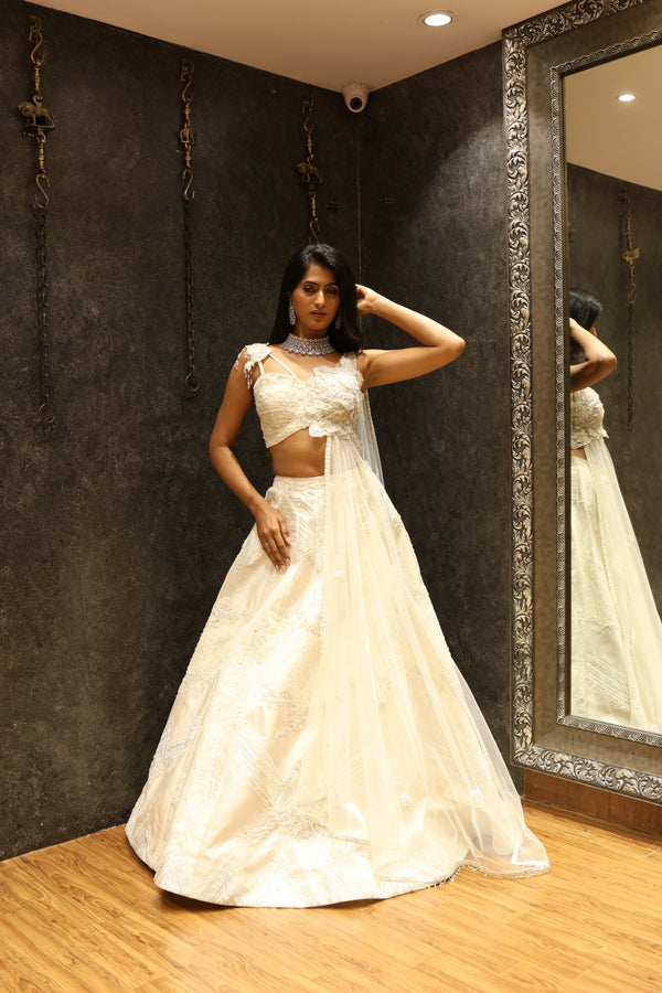 Off white banarasi organza mirror & resham embroidered suit paired with cowl skirt