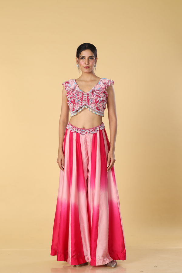 Pink ombrae satin organza palazzo paired with butterfly patterm embroidered blouse