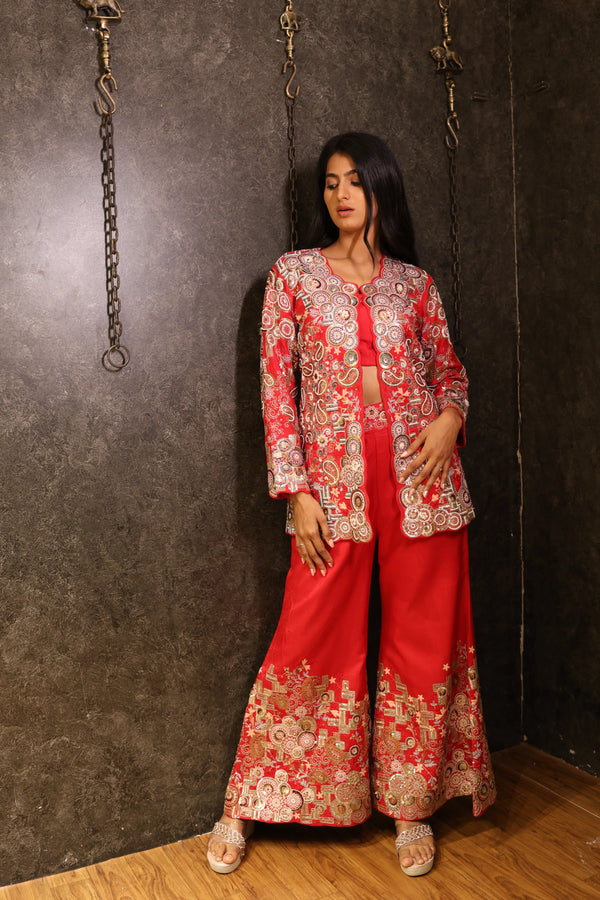 Red Raw Silk Indowestern Set with Zardozi & Thread Work