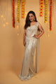 Sophisticated steel grey draped saree meets artisanal luxury, featuring a shimmering cascade of pearl and beads Redefine modern elegance with this subtle yet stunning draped silhouette.