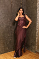 A stunning draped saree crafted from luxurious wine satin organza, embellished with kardana and 3D sequence work. The ensemble is completed with a matching corset blouse.